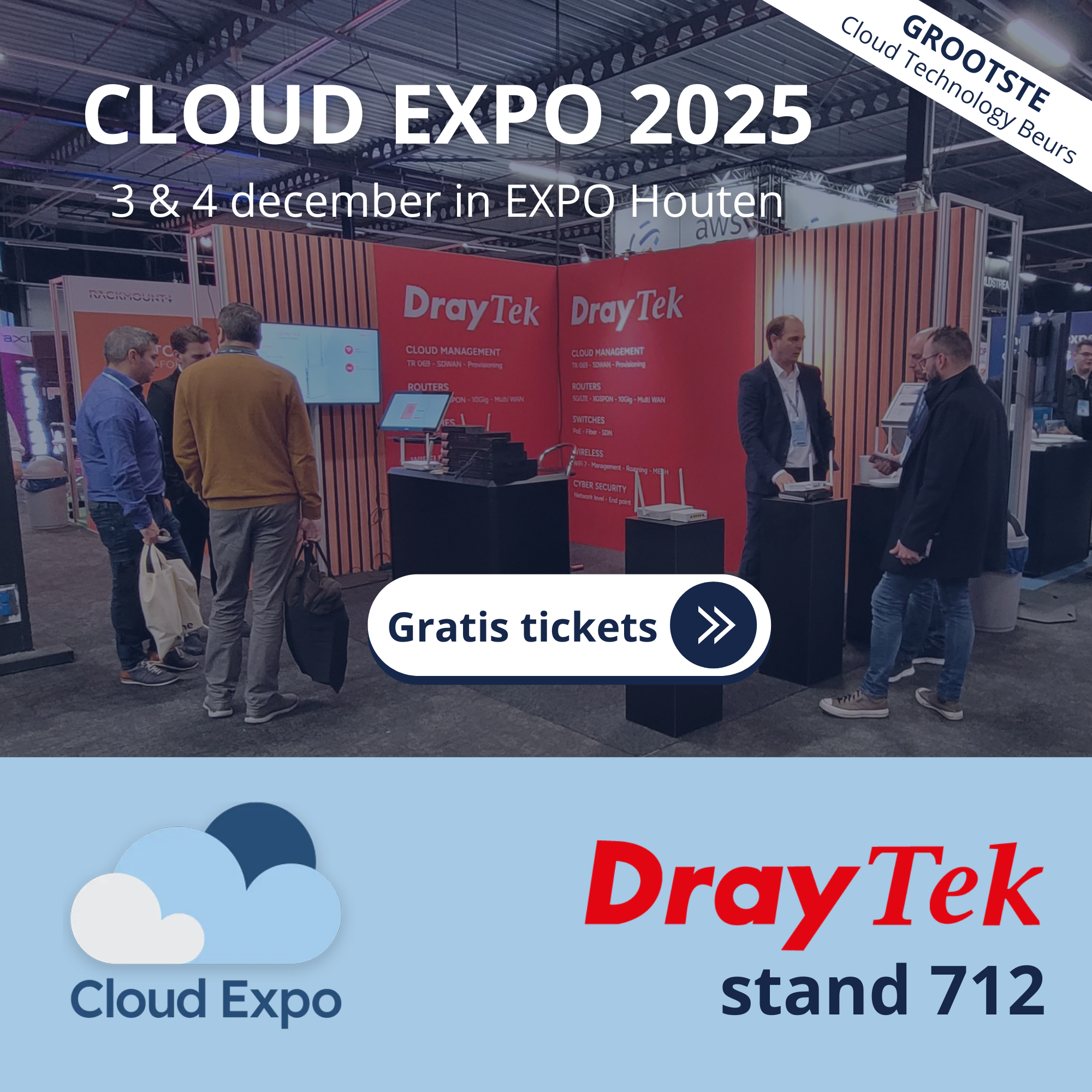 Woensdag 3 en donderdag 4 december staan wij met DrayTek op Cloud Expo 2025 in Expo Houten; dé grootste IT-beurs van Nederland waar cloud, data, AI en security samenkomen. Ontdek de nieuwste DrayTek cybersecurity oplossingen en praat met ons team over de toekomst van connectiviteit. De toegang is gratis, dus meld je snel aan!